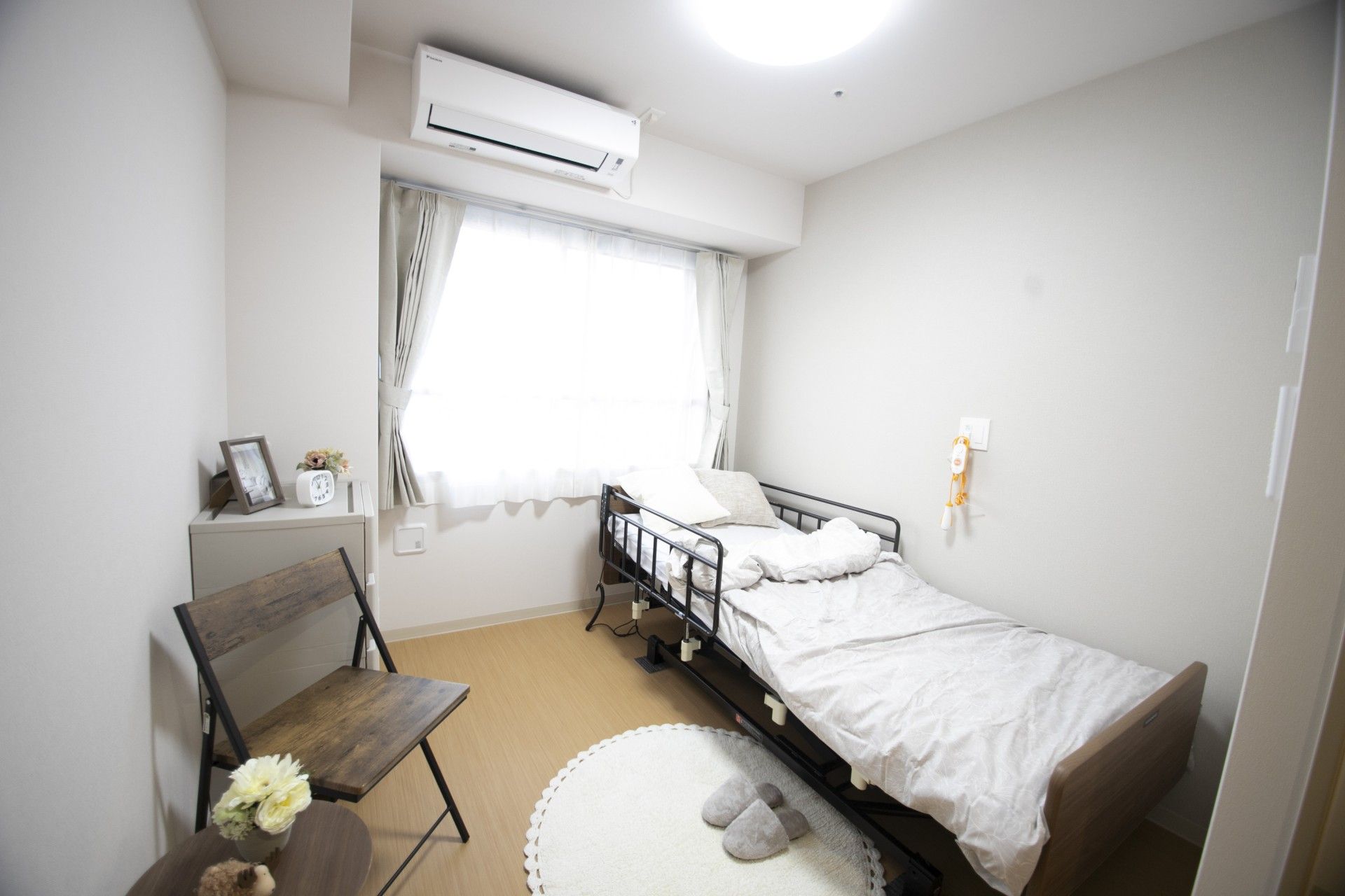 窓からの自然光が差し込む明るいお部屋です。手すり付きのドアで安心して出入りできます。