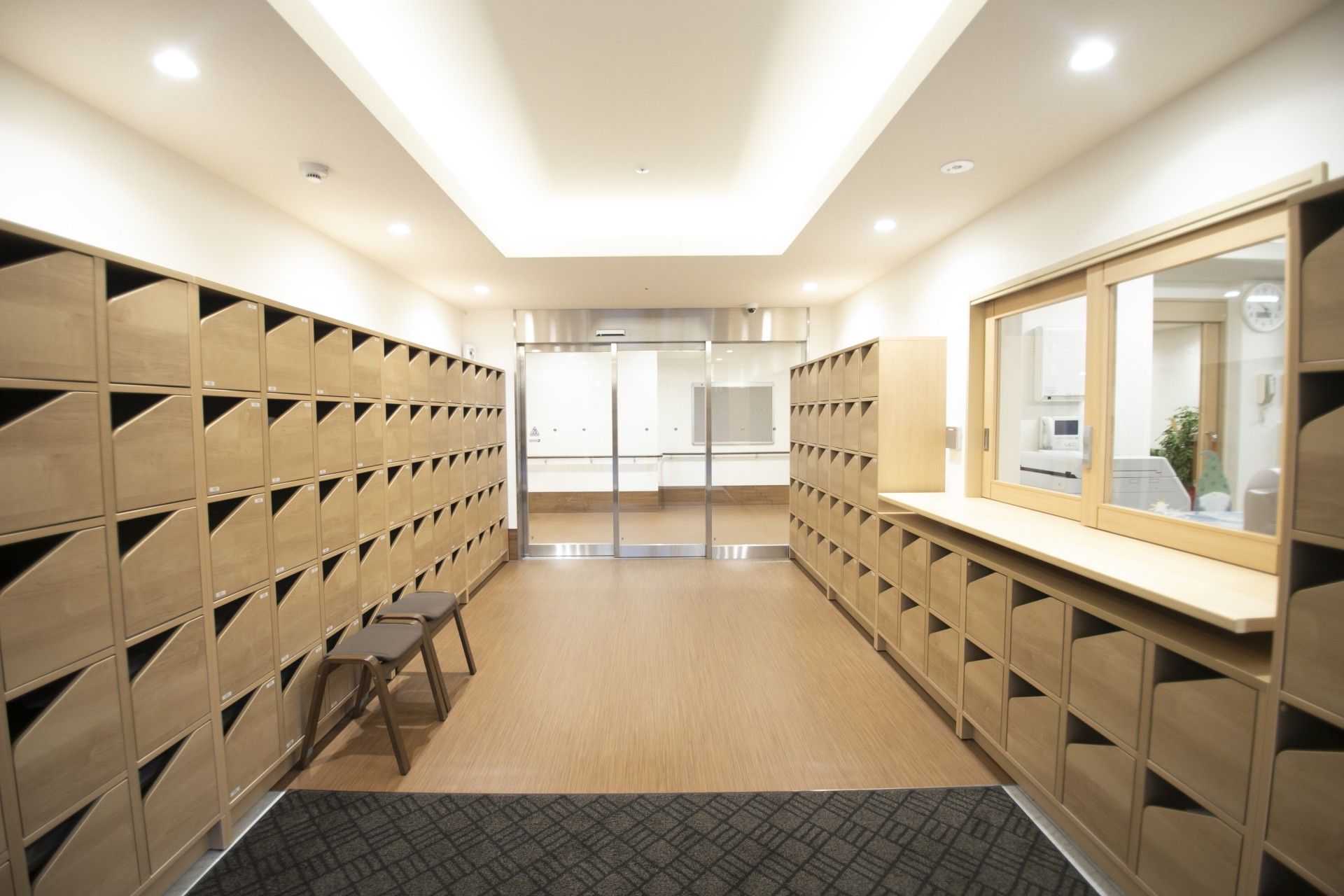 広々としたエントランスには、たくさんの靴箱が整然と並び、出入りがしやすい自動ドアが設置されています。
