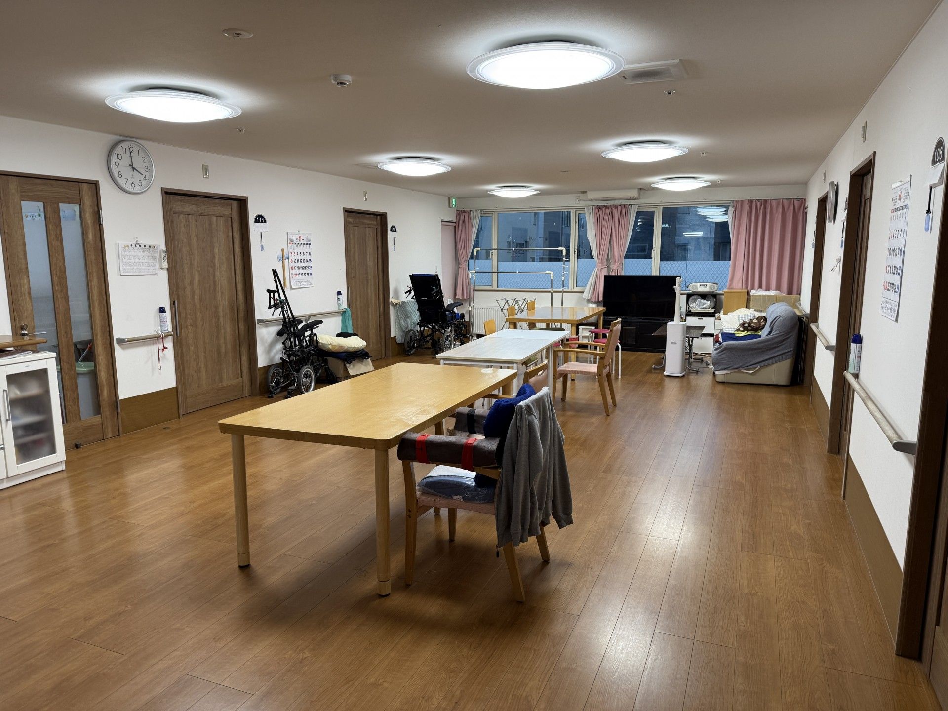 明るい共有スペースで、車椅子の方も安心して過ごせる設計です。リラックスできる椅子も揃っています。