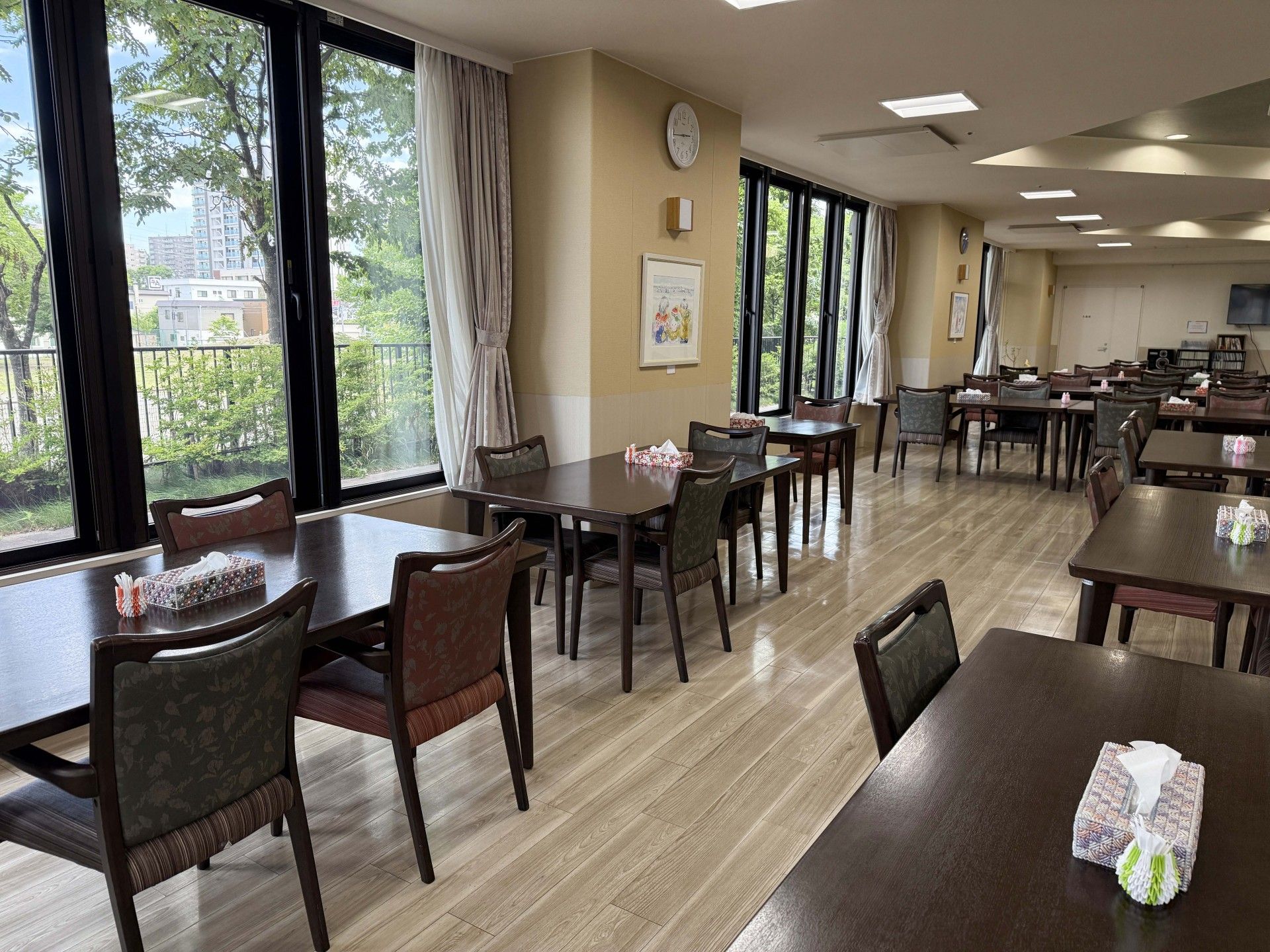 大きな窓から自然光が差し込む食堂です。テーブルがゆったり配置され、快適に過ごせます。