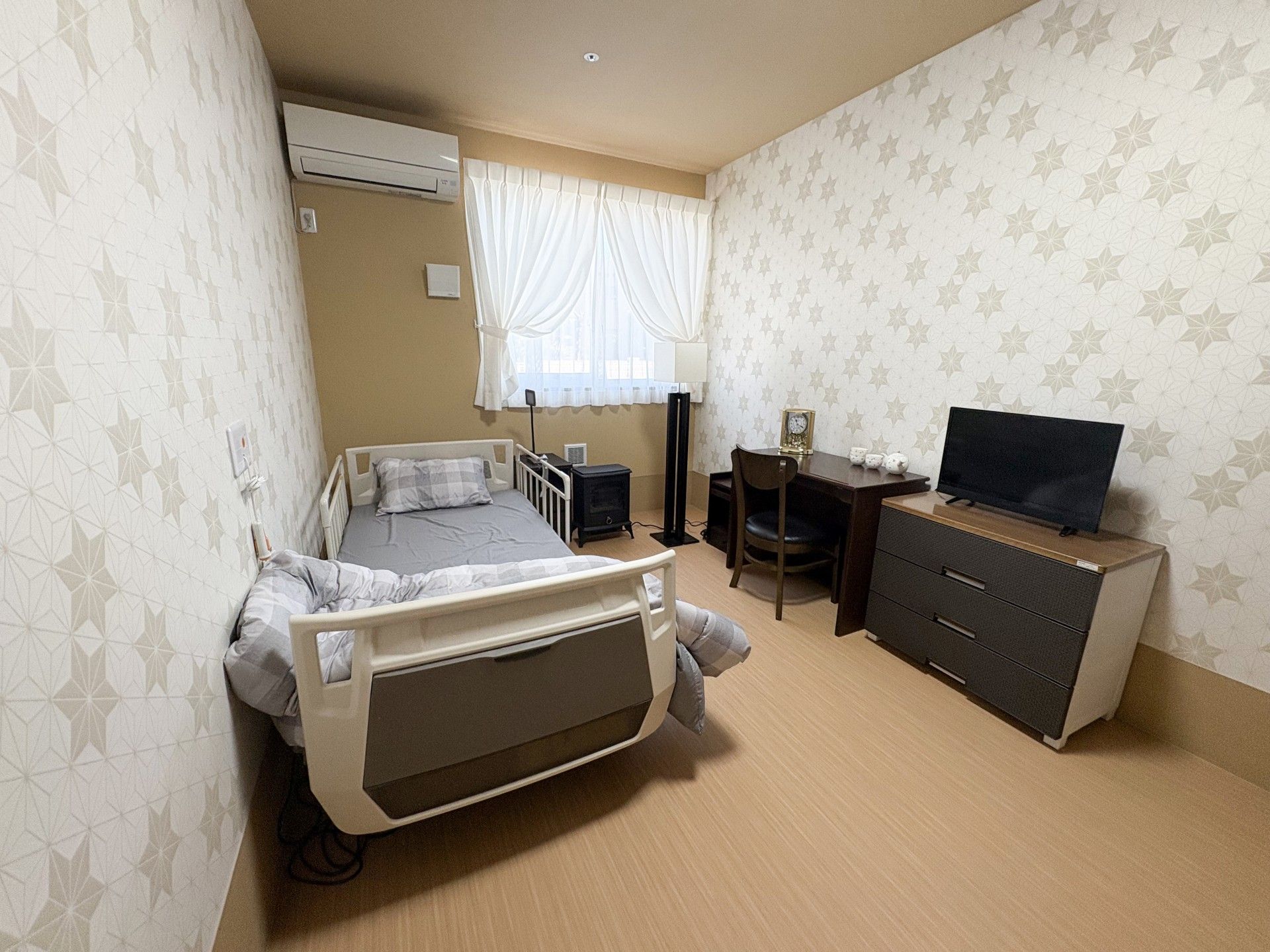 窓からの自然光が心地よく、ベッドやデスクが配置されたプライベートな空間です。