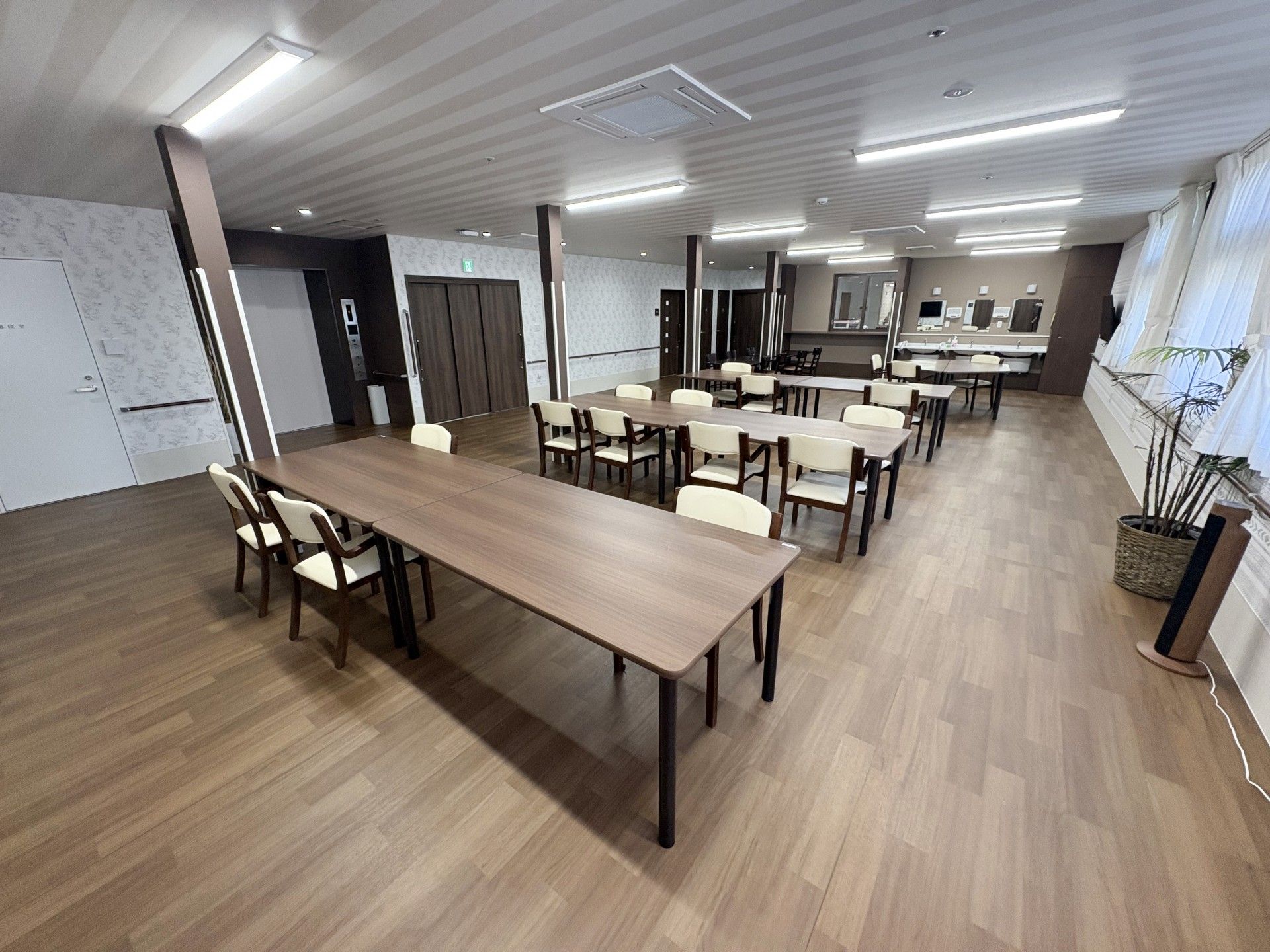 大きな窓から自然光が差し込む、開放的な空間です。テーブルと椅子が整然と配置されています。
