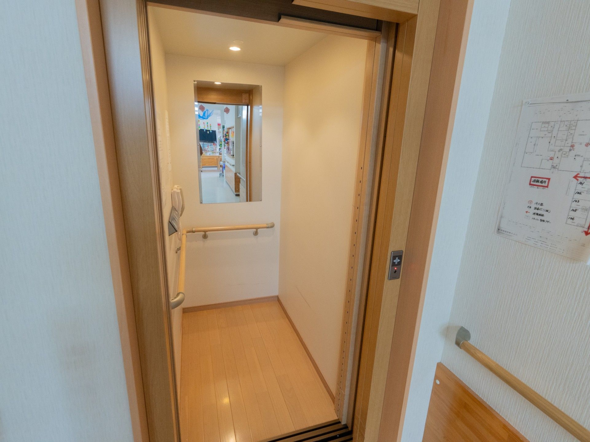 靴棚が整然と並び、出入口には車椅子も置かれています。快適に出入りできる工夫がされています。
