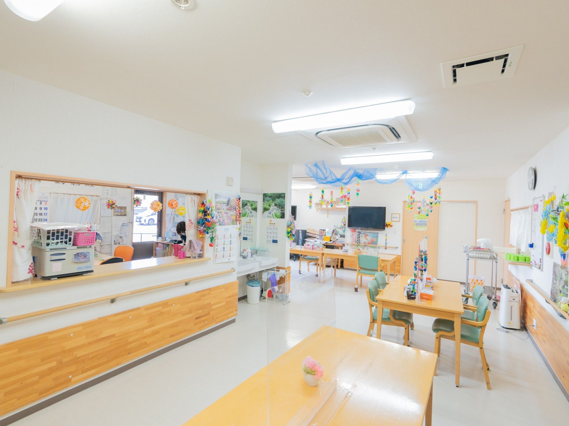 色とりどりの折り紙が天井から吊るされ、楽しい雰囲気を演出しています。テーブルではゆったりとした時間を過ごせます。