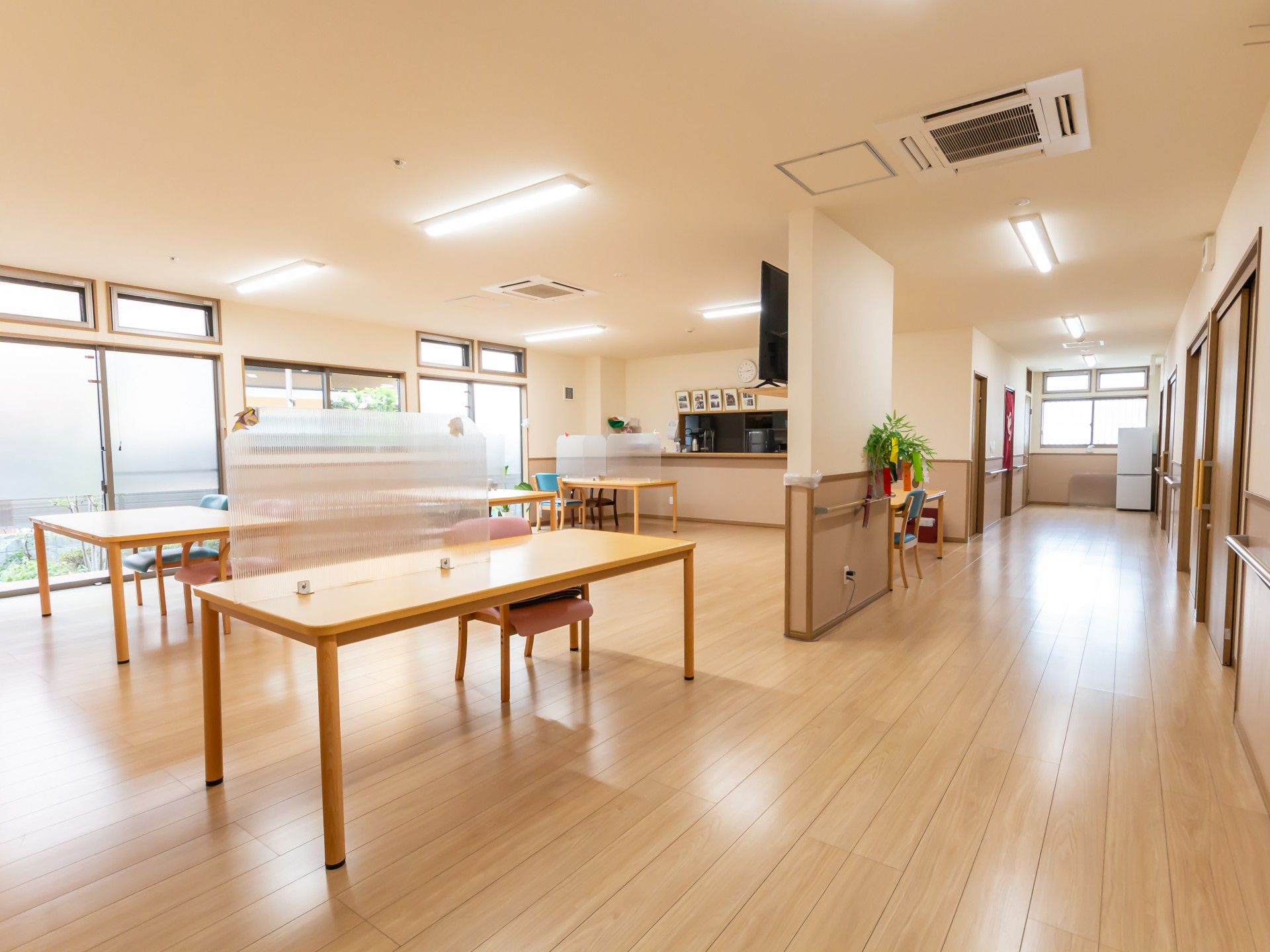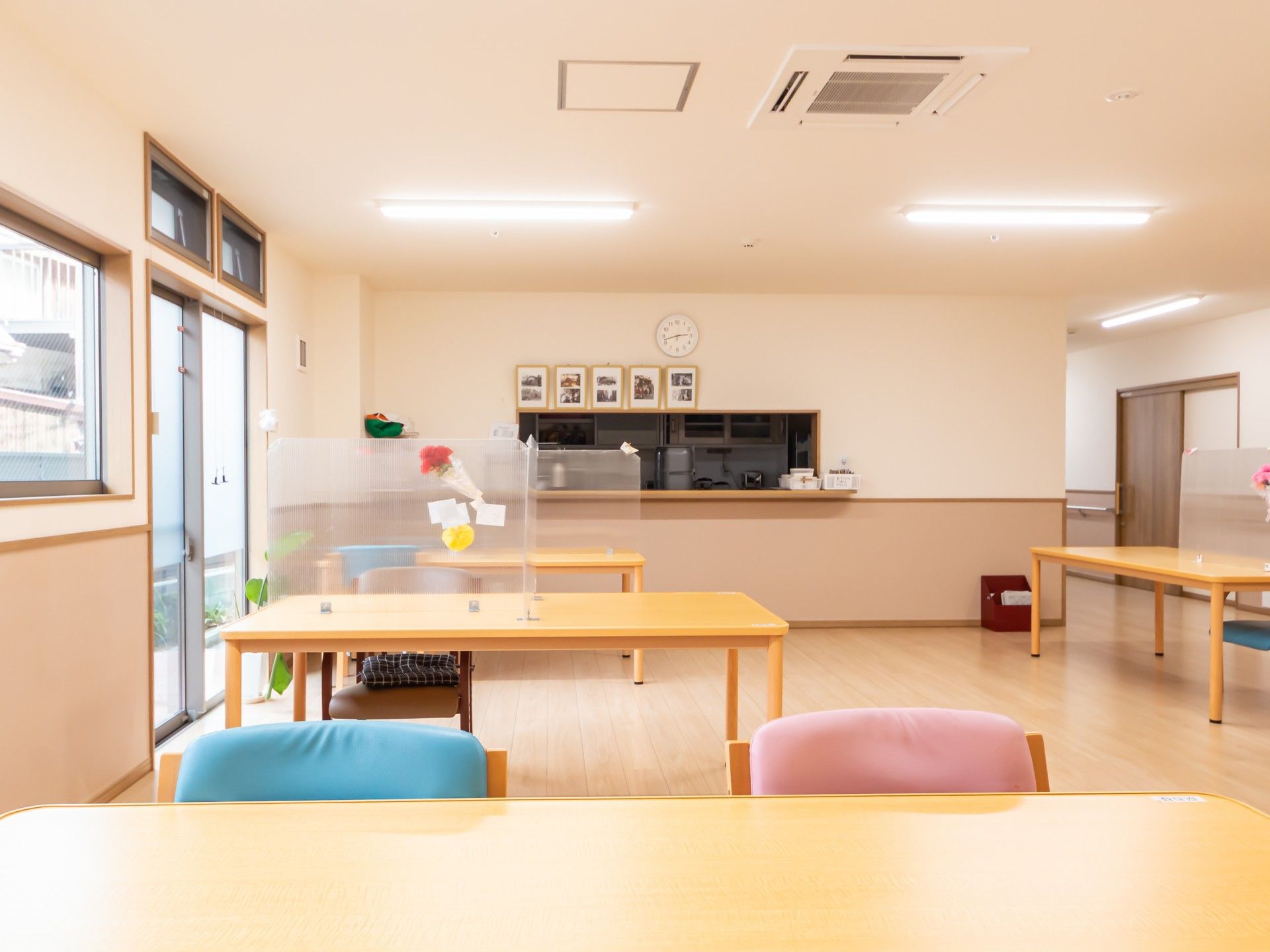 大きな窓から自然光が差し込む、開放的な空間です。テーブルと椅子が配置され、交流の場として最適です。