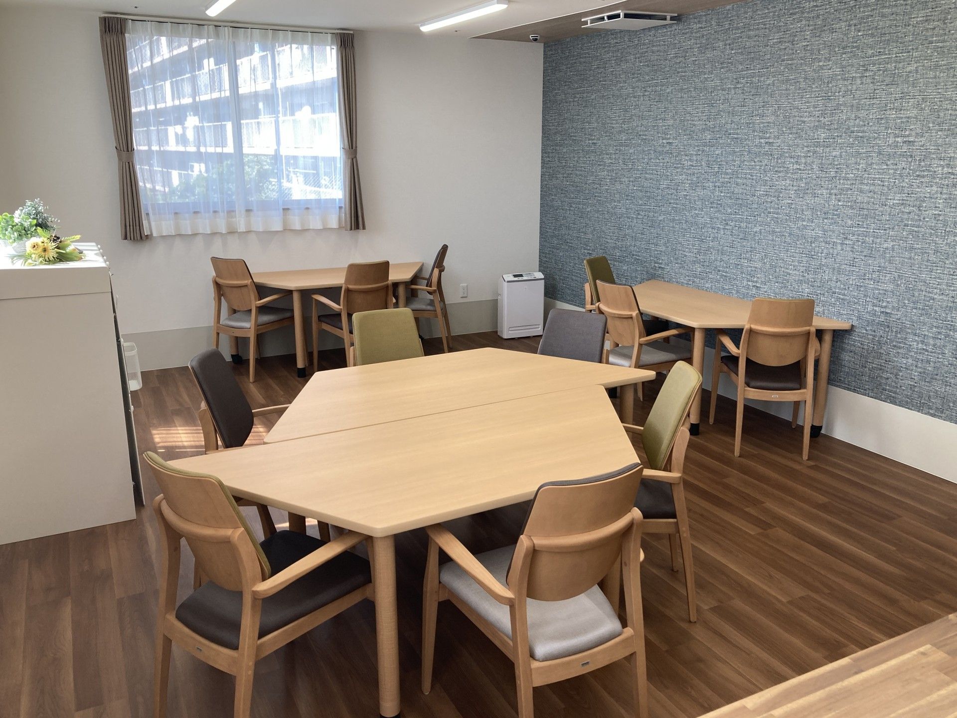 広々とした食堂兼リビングルームは明るい陽光が差し込む開放的な空間で、ご入居者様同士の交流の場となっています。ここでは毎日の食事だけでなく、様々なレクリエーションも行われます。季節ごとの行事として、お花見会や夏祭り、敬老会、クリスマス会などを開催し、四季を通じて楽しみを提供しています。また、定期的に音楽療法や園芸療法、手芸教室などのアクティビティも実施し、ご入居者様の生きがいづくりをサポートしています。ご家族様も参加いただけるイベントも多数ございますので、大切な方との時間も豊かに過ごしていただけます。