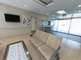• ガラス製の窓に沿って、白色のベンチや椅子が並べられている。奥にも椅子が置かれ、壁にはテレビが設置してある。