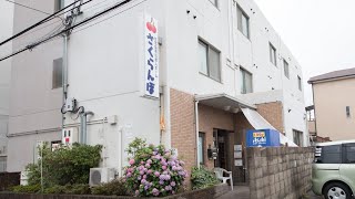 真っ白な施設に大きなさくらんぼのイラストの看板が目印になります。玄関前のあじさいなどの植栽が迎えてくれています。