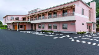 ピンクの外壁が明るく、玄関の周りには鉢に花が植えられた明るい雰囲気で来訪者様をお出迎えしております。