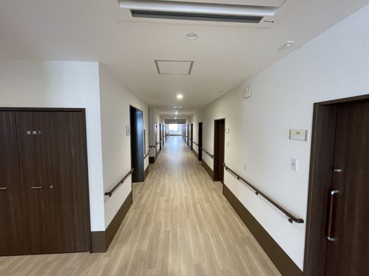 • 手すりが設置された明るく広々とした廊下です。安心して歩行できる環境が整っております。