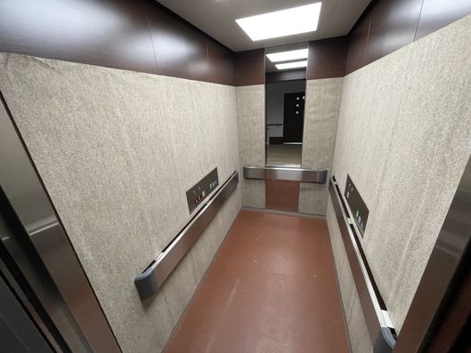 • 広々としたエレベーターは、手すりが設置されており、安心してご利用いただけます。車椅子の方もスムーズに移動できる設計です。