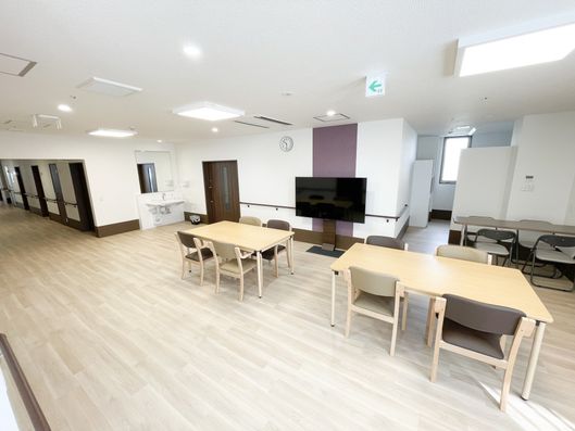 • ゆったりとした空間でのびのびと過ごせる共有リビングです。大画面テレビがあり、皆で楽しいひとときを過ごせます。