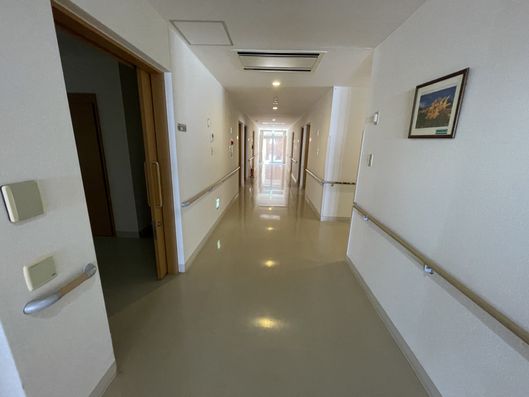 明るい廊下には、車椅子や歩行器が置かれており、移動がしやすい設計になっています。