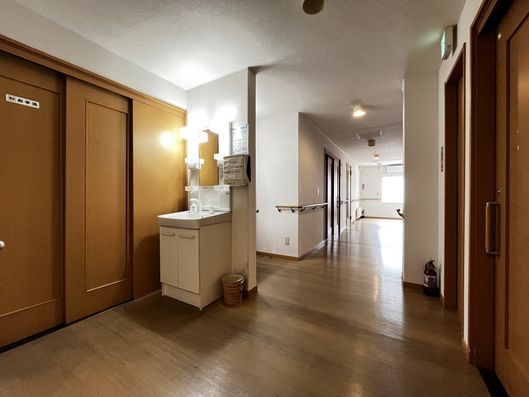 手すりが設置された廊下は、移動が安心です。洗面台も近くにあり、便利にご利用いただけます。