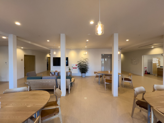 ゆったりとした空間が広がる共有スペースの一角です。大きな窓からは自然光が差し込み、穏やかな時間をお過ごしいただけます。