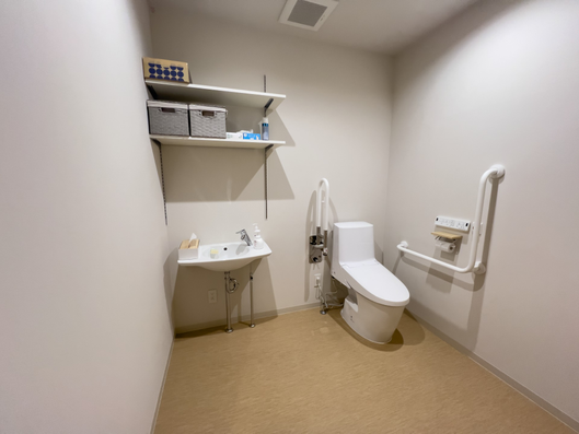 手すり付きの清潔なトイレ空間です。安心してご利用いただけるよう、細やかな配慮がされています。