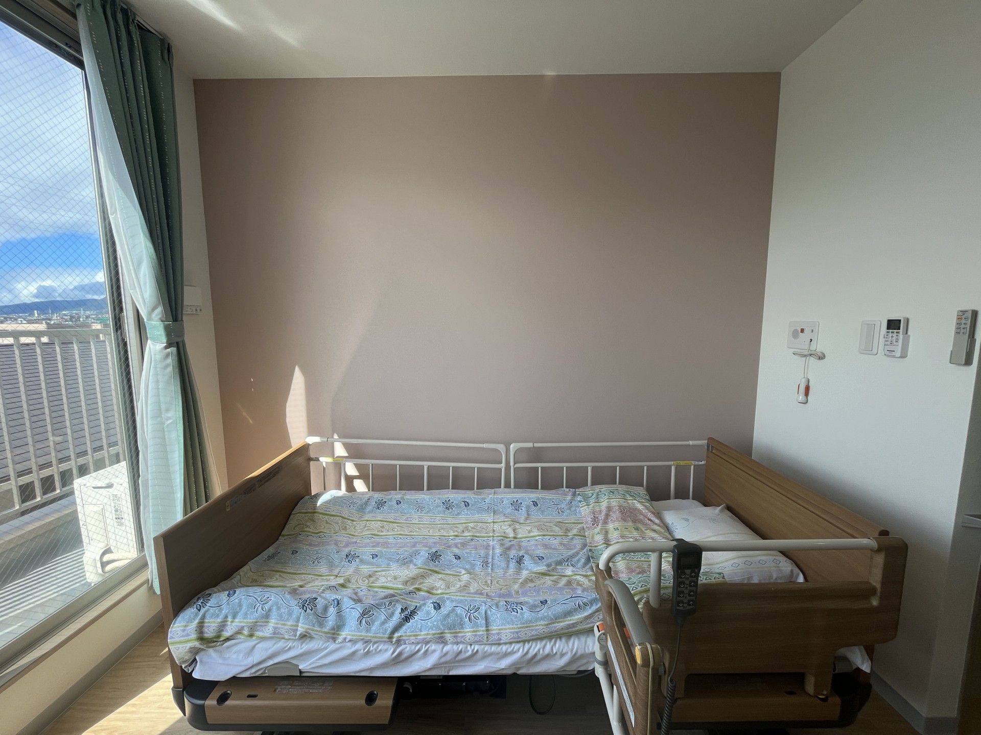ベッドと車椅子が配置された個室で、快適に過ごせる空間が整っています。