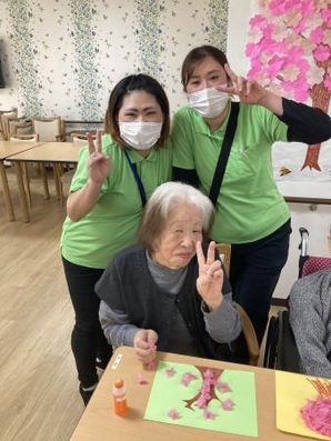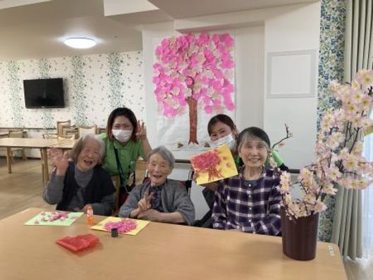 入居者の皆さまとスタッフが一緒に、春を感じる桜の壁面飾りを制作している様子です。和やかな雰囲気の中、手先を使った作業を楽しみながら交流し、笑顔があふれるひとときとなっています。