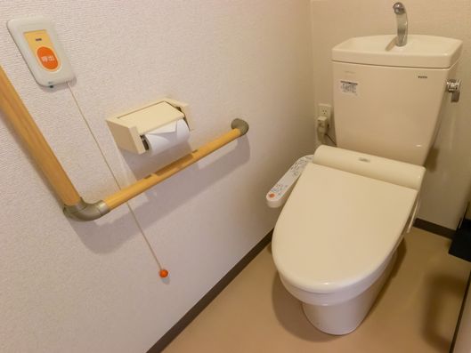手すり付きのトイレ設備で、安心してご利用いただけます。非常ボタンも設置され、安全に配慮された空間です。