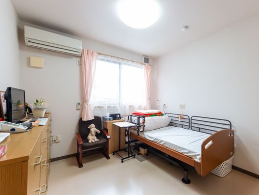 ゆったりとしたベッドと、整理整頓された収納スペースが確保された居室です。個々の生活スタイルに合わせた空間で、安心してお過ごしいただけます。
