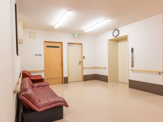 ゆったりとした待合室には、手すり付きのベンチとテーブルが設置されており、訪れる方々の憩いの場となっています。