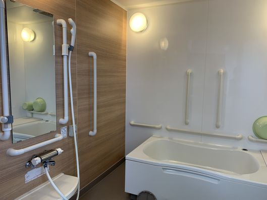 ゆったりとした造りの居室です。手すりや洗面台が整っており、安心して日々を過ごせる環境が整っています。