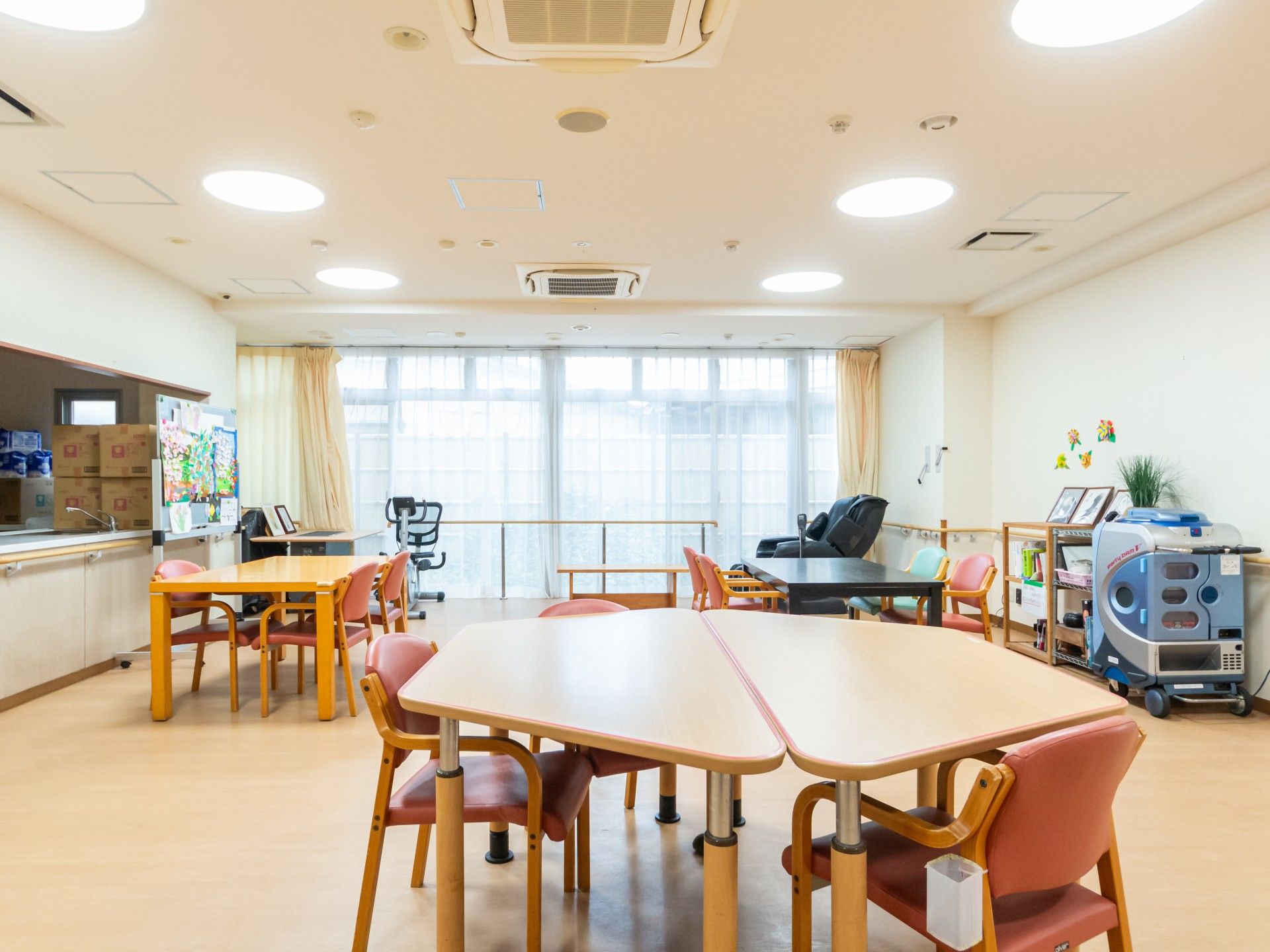 大きな窓から自然光が差し込む、開放的な空間です。テーブルや椅子が配置され、交流の場として最適です。