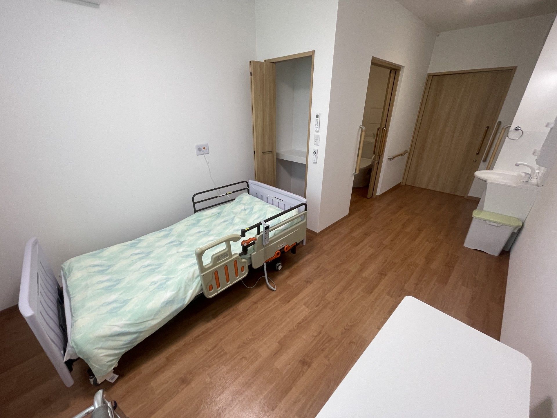 シンプルで機能的な空間には、ベッドや歩行器が配置され、安心して過ごせる環境が整っています。