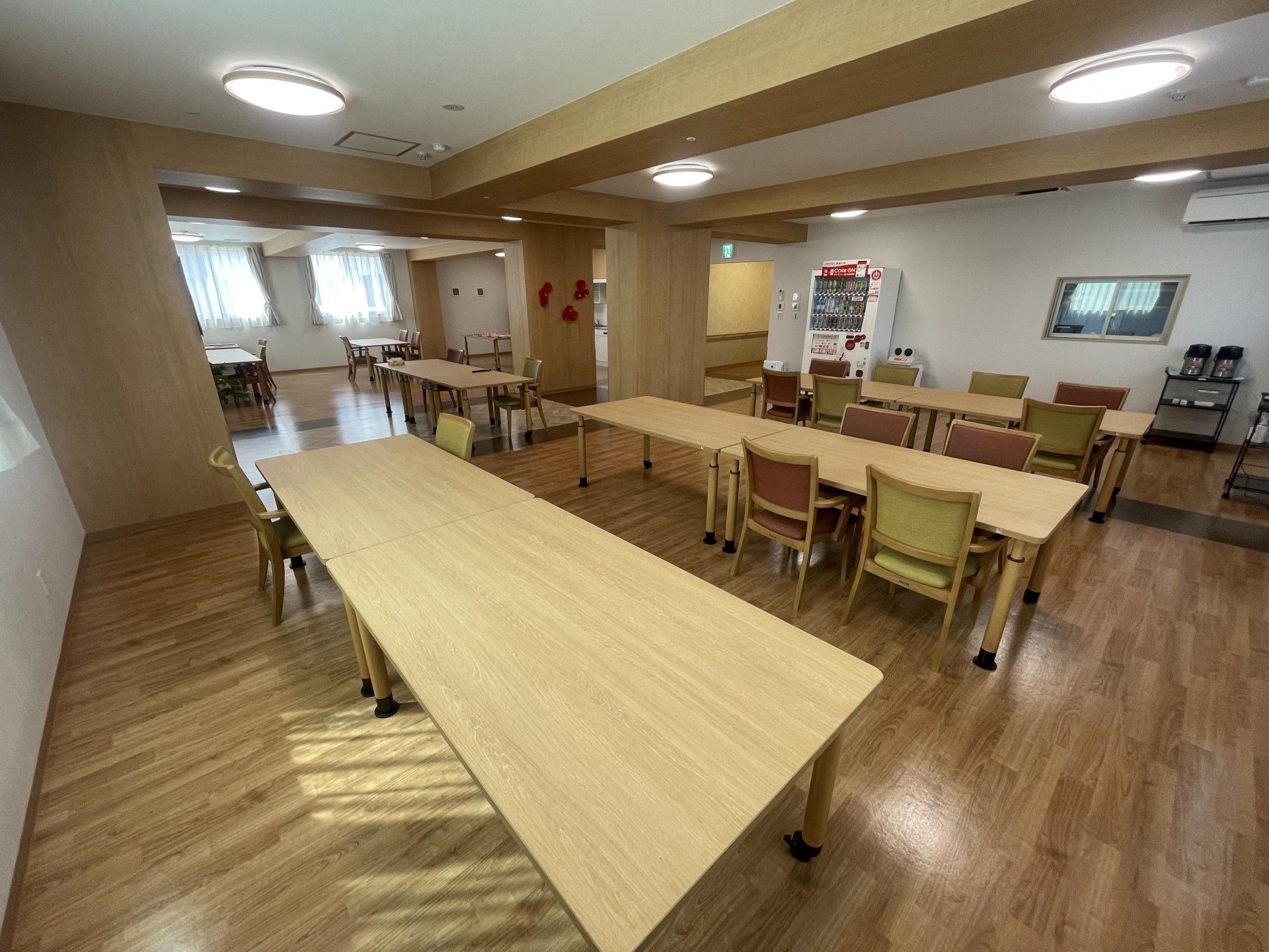 大きなテーブルと椅子が並ぶスペースで、会話や活動がしやすい環境です。