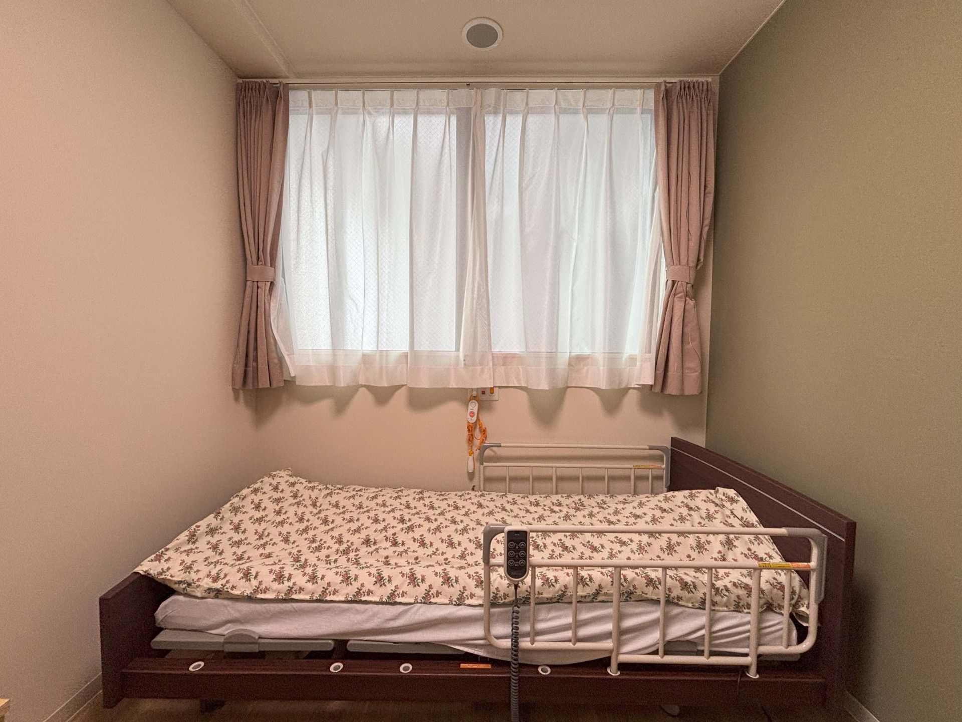 窓からの柔らかな光が差し込む、シンプルで落ち着いた雰囲気の寝室です。