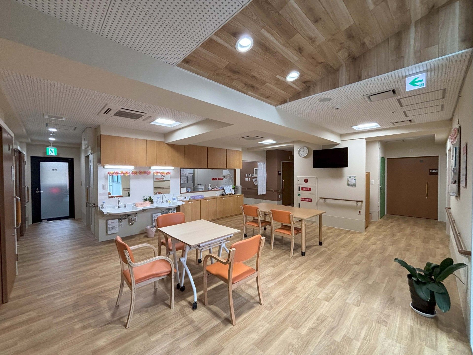 木目調の床と明るい照明が心地よい空間です。テーブルと椅子が配置され、交流の場として最適です。