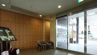 吹き抜け天井で、ガラス張りの大きな天窓のある明るい廊下です。両側には手すりがございますので、安全にご通行いただけます。