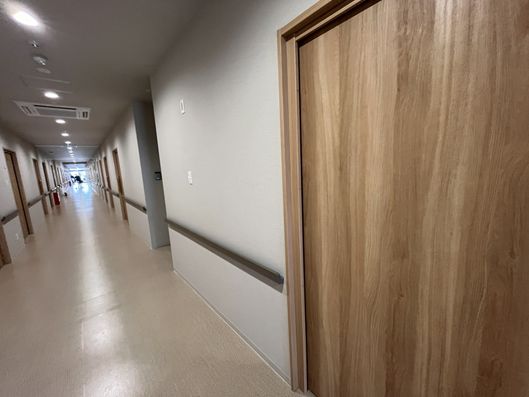 ゆったりとした廊下は清潔感があり、どなたでも安心してお過ごしいただける環境です。遠くに人の姿も見え、穏やかな日常が感じられます。