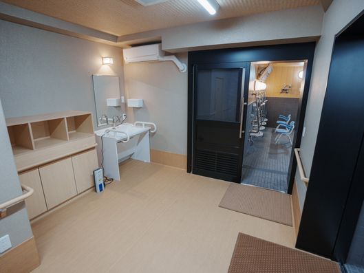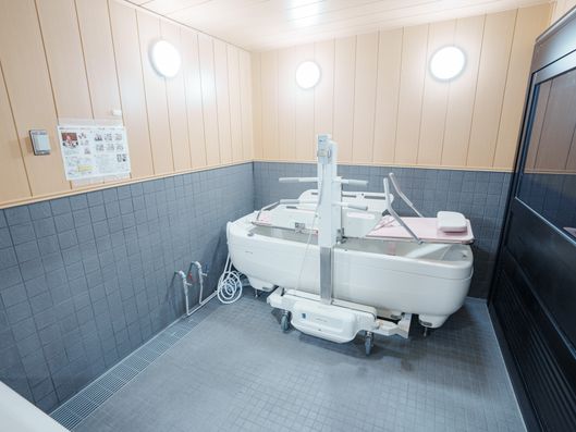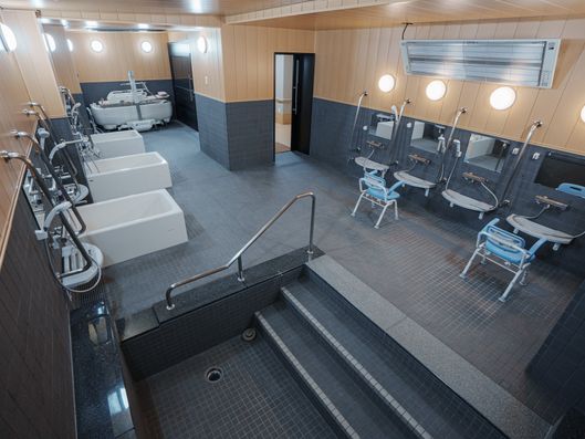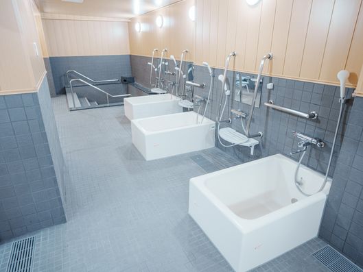 • 個浴槽 お一人ずつご入浴いただける個浴層も完備。3方向からサポートできるので、おひとりでのご入浴が不安な方も安心です。
