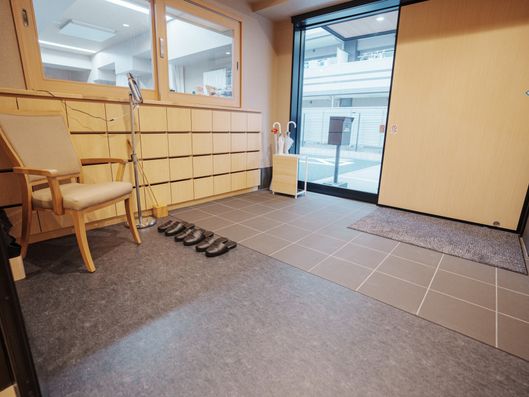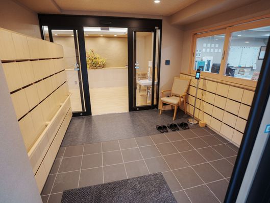 • 玄関 玄関周りにも段差がなく、車いすをご利用の方も出入りがスムーズにできる自動ドアを設置。屋根も付いております。