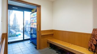 玄関には自動販売機があり、ちょっとした飲み物を手軽に購入できます。ベンチも設置されています。