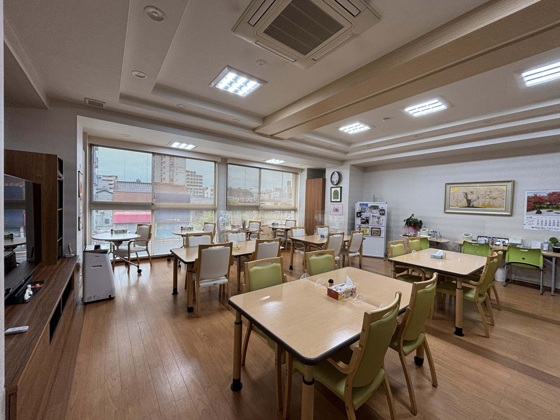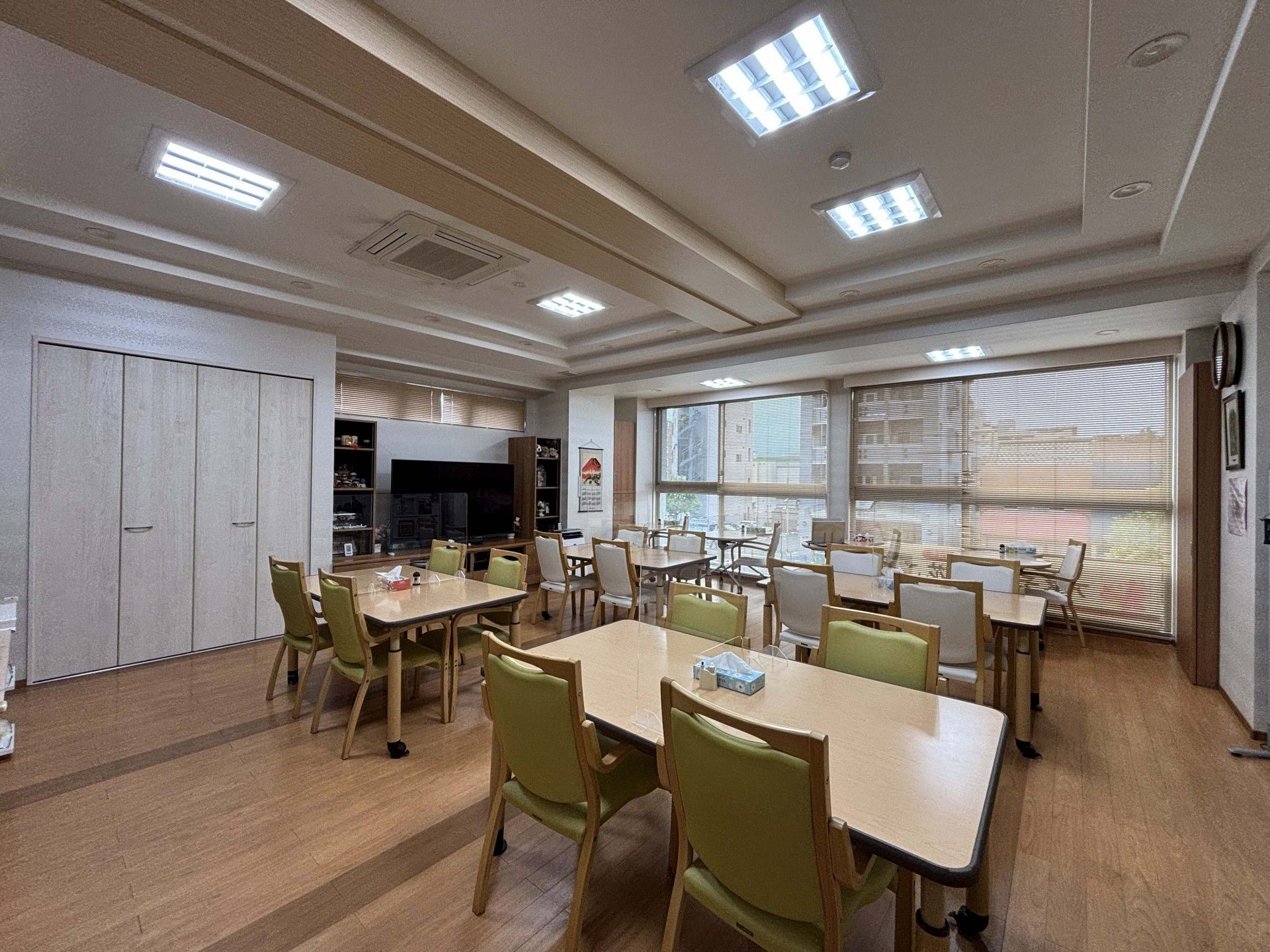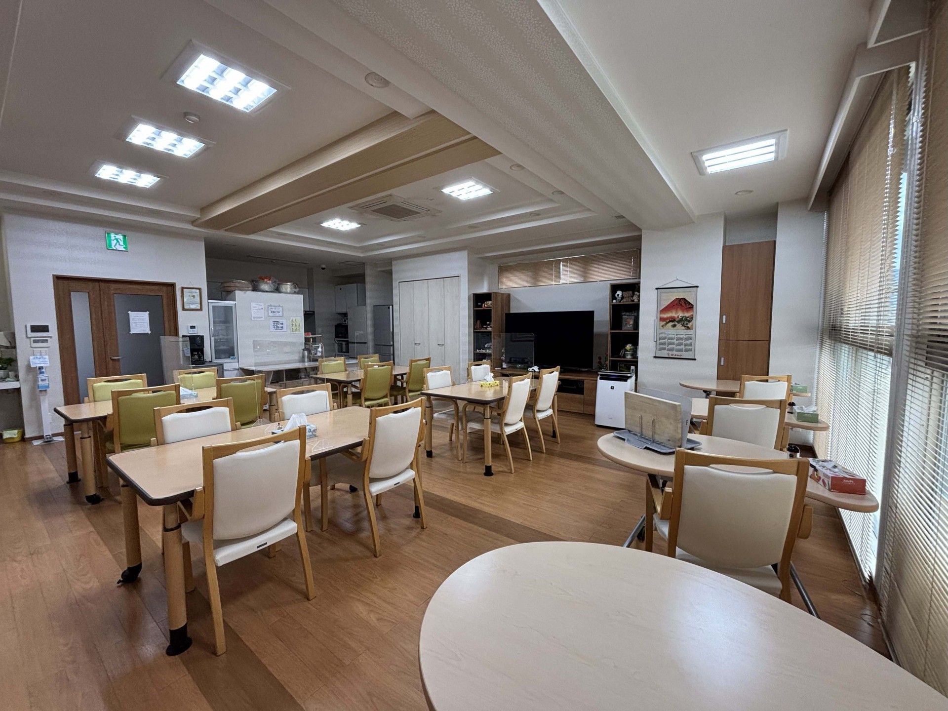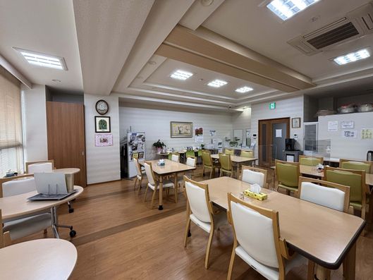 設内には、地域交流スペースが完備されており、ご入居者様が毎朝ゆっくりと朝食を楽しむ場所として利用されています。広々としたお部屋の南側にある大きな窓からは、自然光がたっぷりと差し込み、明るく開放的な空間で食事をお楽しみいただけます。この場所では、ご入居者様同士の交流も生まれ、食事の時間が心温まるひとときとなっています。