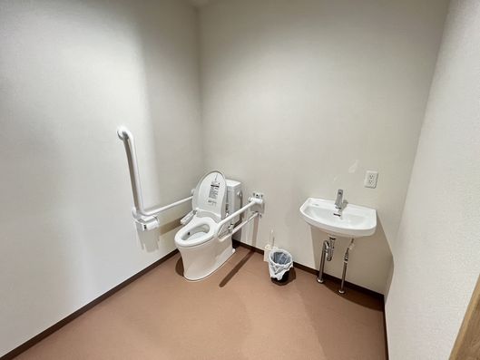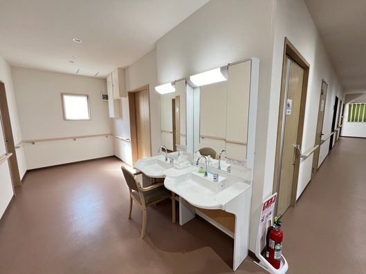 手すり付きで安全に配慮された洗面所です。ゆったりとした空間で、日々の身支度を快適に行えます。