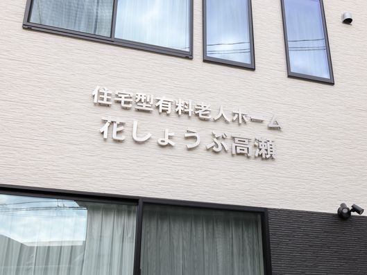 • 住宅型有料老人ホーム花しょうぶ高瀬と書かれたツートンカラーの壁の2階建て建築物