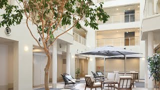 デザインの異なるテーブルセットが複数置かれたホール。おひとりで、ご友人、ご家族と共にお過ごしいただけます。
