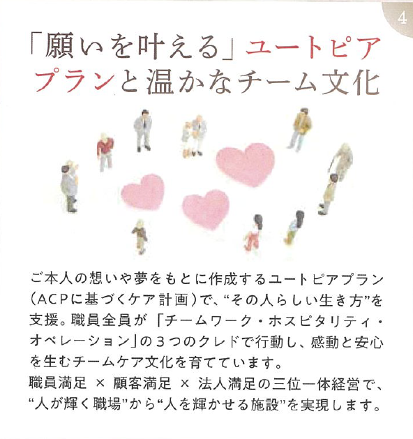 ご本人の想いや夢をもとに作成するユートピアプラン(ACPに基づくケア計画)で、“その人らしい生き方”を支援。職員全員が「チームワーク・ホスピタリティ・オペレーション」の3つのクレド(行動規範)で行動し、感動と安心を生むチームケア文化を育てています。職員満足×顧客満足×法人満足の三位一体経営で、“人が輝く職場”から“人を輝かせる施設”を実現します。