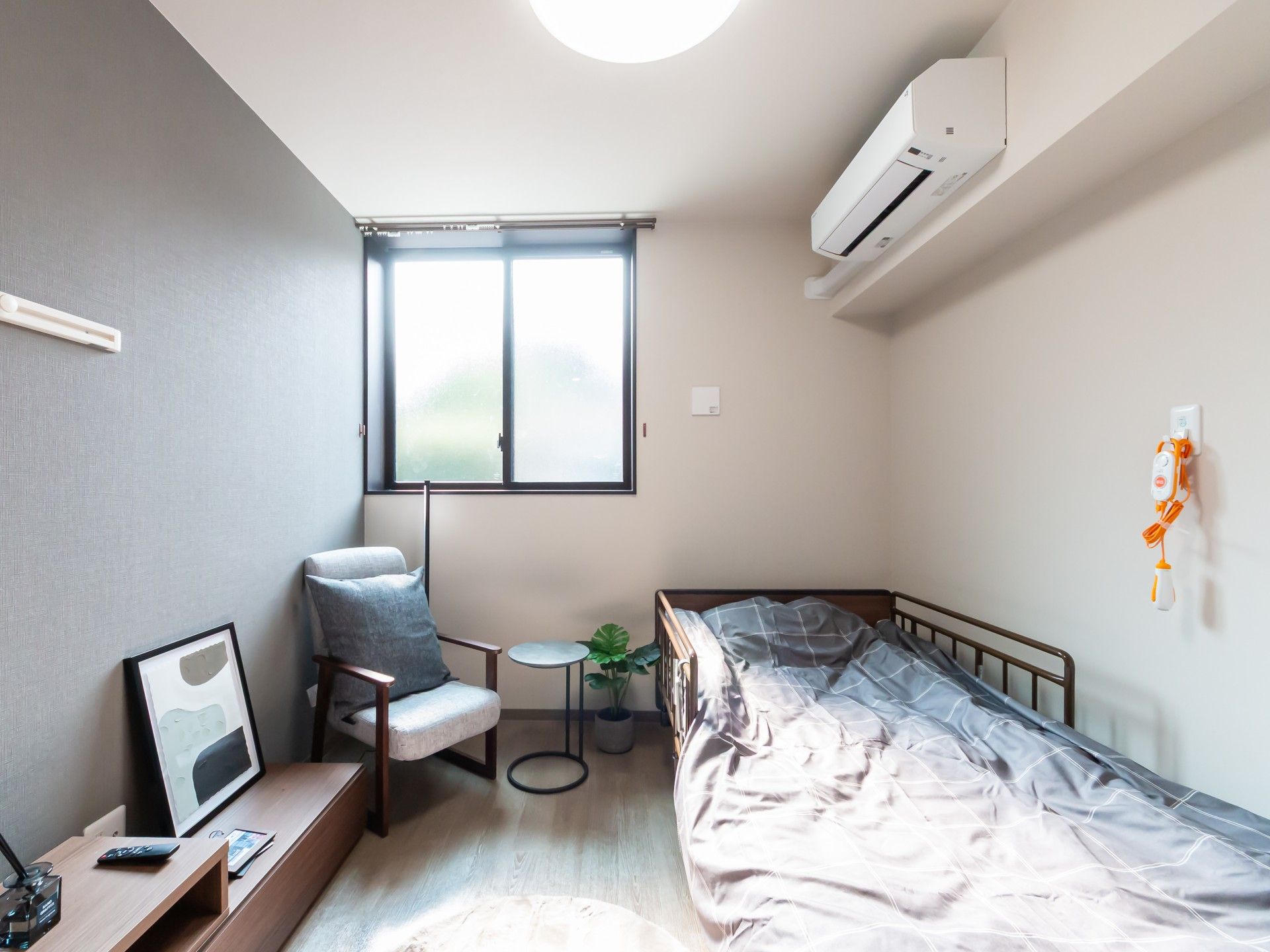 窓からの自然光が心地よい空間です。ベッド横にはリラックスできる椅子が配置されています。