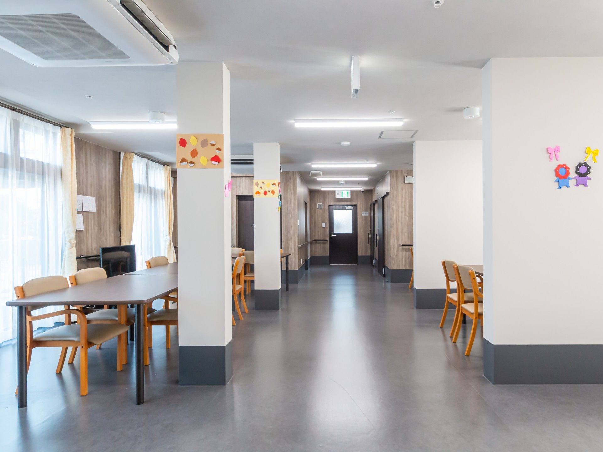 大きな窓から自然光が差し込む廊下です。テーブルと椅子が配置され、交流の場として活用できます。