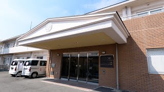• 2階建ての建物で、玄関は大きな屋根が取りつけられている。バリアフリーの床と透明な自動ドアである。送迎車も停まっている。