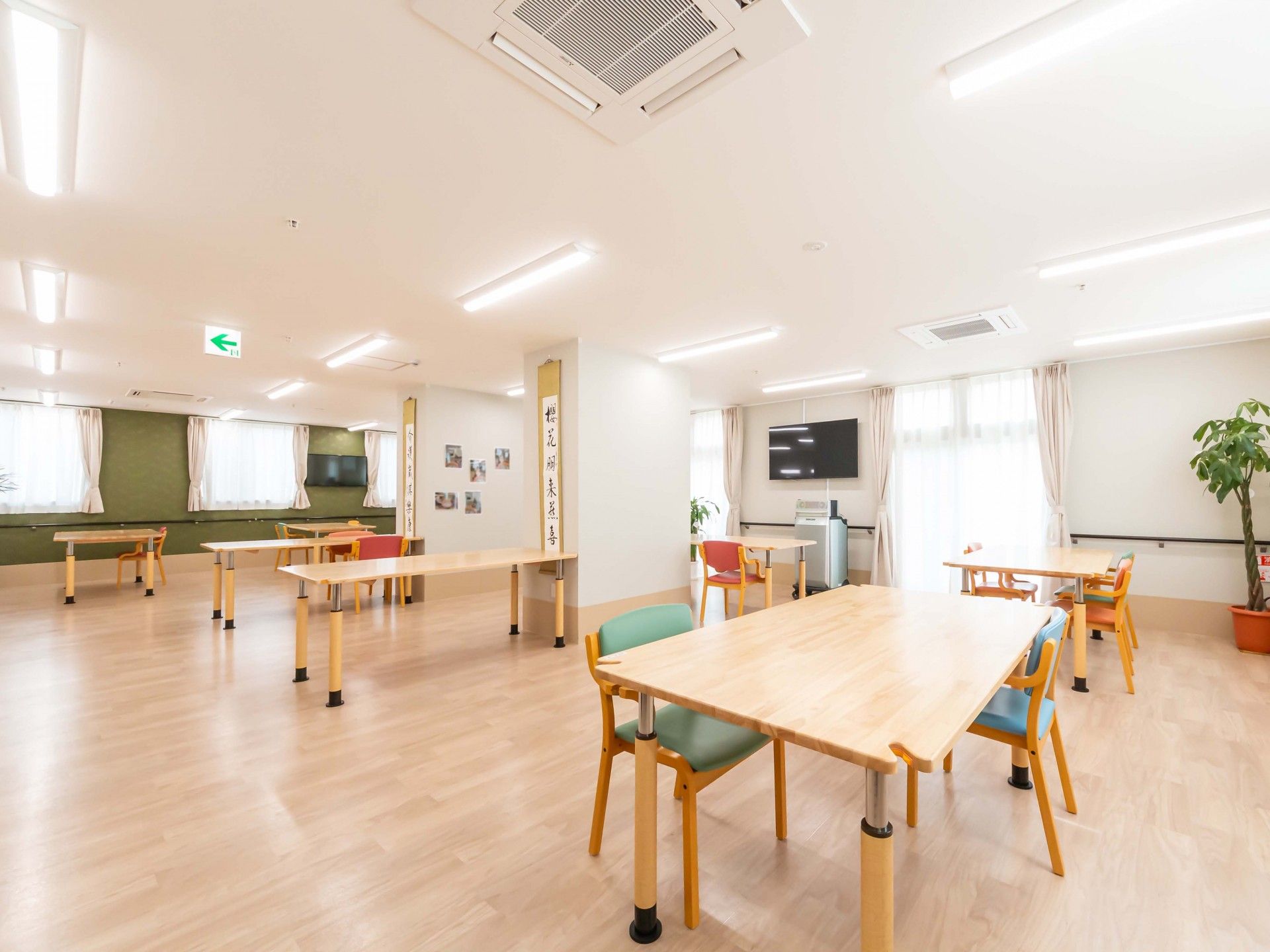 「晴好園」では、ご入居者様同士の交流を促進する共用スペースを完備しています。明るく開放的な空間で、ご入居者様がリラックスしてお過ごしいただけます。季節に応じた多彩なレクリエーションやイベントを定期的に開催し、ご入居者様の生活に彩りを添えます。心温まる食事は多様なメニューで、食事の時間も楽しみの一つとなっています。レクリエーションを通じて身体機能の維持・向上を図りながら、ご入居者様の笑顔あふれる日常生活をサポートいたします。施設全体で約999㎡の広さがあり、ゆとりある空間で快適に過ごしていただけます。