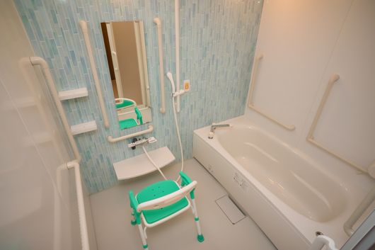 ゆとりのある浴室で快適な入浴を。手すりや介護用チェアも完備しておりますので、安心してご利用いただけます。