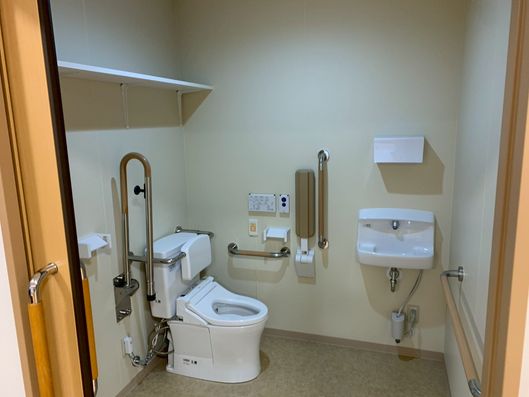 手すりが設置されたトイレは、安全に配慮されており、どなたでも安心してご利用いただけます。