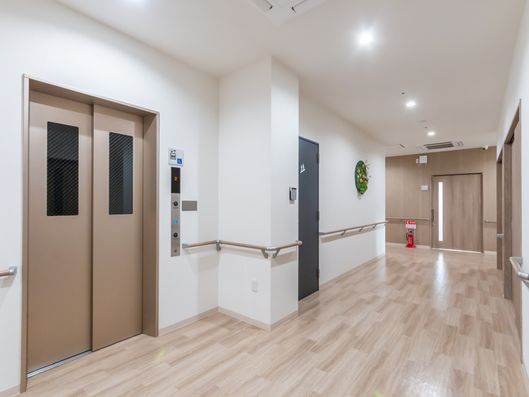 手すりが設置された廊下は、移動が安心です。エレベーターも近く、便利にご利用いただけます。