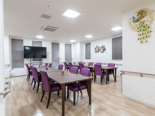 紫の椅子が並ぶ食事スペースは、明るい照明で快適に過ごせる空間です。