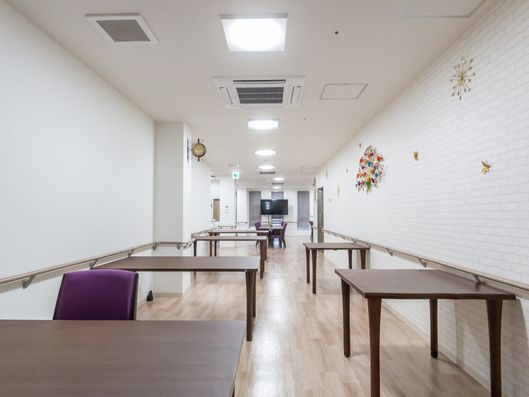 手すりが両側に設置され、安心して歩行できる明るい廊下です。